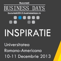 In perioada 10-11 decembrie, va avea loc la Bucuresti cea de-a 13-a editie din suita de evenimente Business Days, care isi propun, asa cum arata si motto-ul acestora, sa ofere "inspiratie, experienta si oportunitati celor care vor sa genereze valoare in Romania". Bucuresti Business Days, cel de-al patrulea si ultimul eveniment din serie organizat in acest an, va fi gazduit de Universitatea Romano-Americana. Sunt asteptati la eveniment peste 800 de participanti, reprezentanti ai mediului de afaceri, antreprenori, manageri si specialisti.